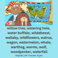 willow tree, watering hole, water buffalo, wildebeest, wallaby, wildflowers, walrus, wagon, watermelon, whale, warthog, worms, wolf, woodpecker, waterfall