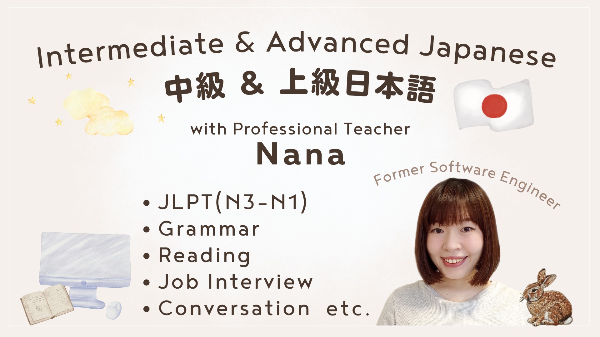 Certified Japanese Teacher with Software Engineer Exp.🌸ソフトウェアエンジニアの経験もあるプロの日本語教師🌸中級・上級向けのいろいろなレッスン I love talking, but I also really enjoy listening! In my lessons, please feel free to talk, even if you're not confident. Also, if there's anything you don't understand during the lesson, please don't hesitate to ask questions! I believe asking questions greatly helps deepen your understanding. If you have any concerns about my lessons in advance, please feel free to send me a message✉️ My lessons are conducted in Japanese, but you are welcome to message me in English. わたしは話すことも好きですが、聞くことも大好きです! わたしのレッスンでは、自信がなくても、ぜひたくさん話してください。 また、わからないことがあれば、レッスンでぜひ質問してください! 質問をすることは、日本語の理解を深めることに、とても役立つと考えています。 わたしのレッスンについて聞きたいことがある場合、お気軽にメッセージしてください✉️ レッスンは日本語で行ないますが、メッセージは英語でも大丈夫です。