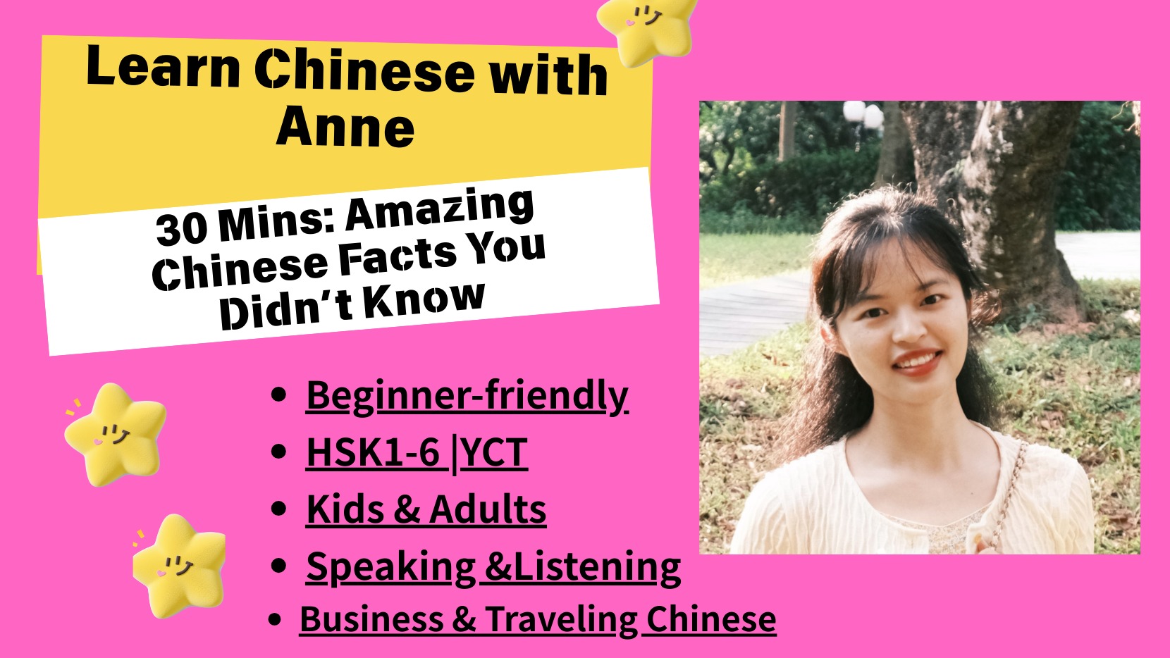 👉8,000レッスン以上|認定講師(5年以上の経験)|👏初級-会話-子供-AP/HSK試験 あらゆる年齢層の生徒さんを5年間教えた経験があります。 専門は中国語会話、AP/HSK試験準備、子供向け中国語です。 レッスン構成 私のレッスンは、学習したことを本当に覚えて使えるように、効果的な学習サイクルに沿っています: 復習 → インプット → アウトプット → 応用 前回のレッスンのキーフレーズを復習します。 実際の教材(ビデオ、ニュース、日々のトピック)に基づいた新しい内容。 スピーキング練習、センテンスビルディング、ロールプレイ。 →授業後:デジタルフラッシュカードで復習。 →次回の授業では、同じ単語を新しい文脈に当てはめます。 これにより、学習は着実に、自然に、そして非常に効果的になります。