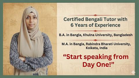 I am Tania Haque, a native Bengali speaker, born and brought up in Bangladesh. I have completed my B.A. in Bangla Language and Literature from Khulna University, Bangladesh, and M.A. in the same discipline from Rabindra Bharati University, Kolkata, India. I teach Bangla language, literature, history, culture, and politics with a comprehensive and engaging approach. I can speak Bangla, English, Hindi, and a little bit of French. With over 6 years of teaching experience, I have delivered 6,000+ online lessons and received 266+ positive reviews from students. I am an expert in teaching Spouses or Family Members of Bangladeshis, Researchers and Academics,Diplomats, NGO Workers, Travellers etc.