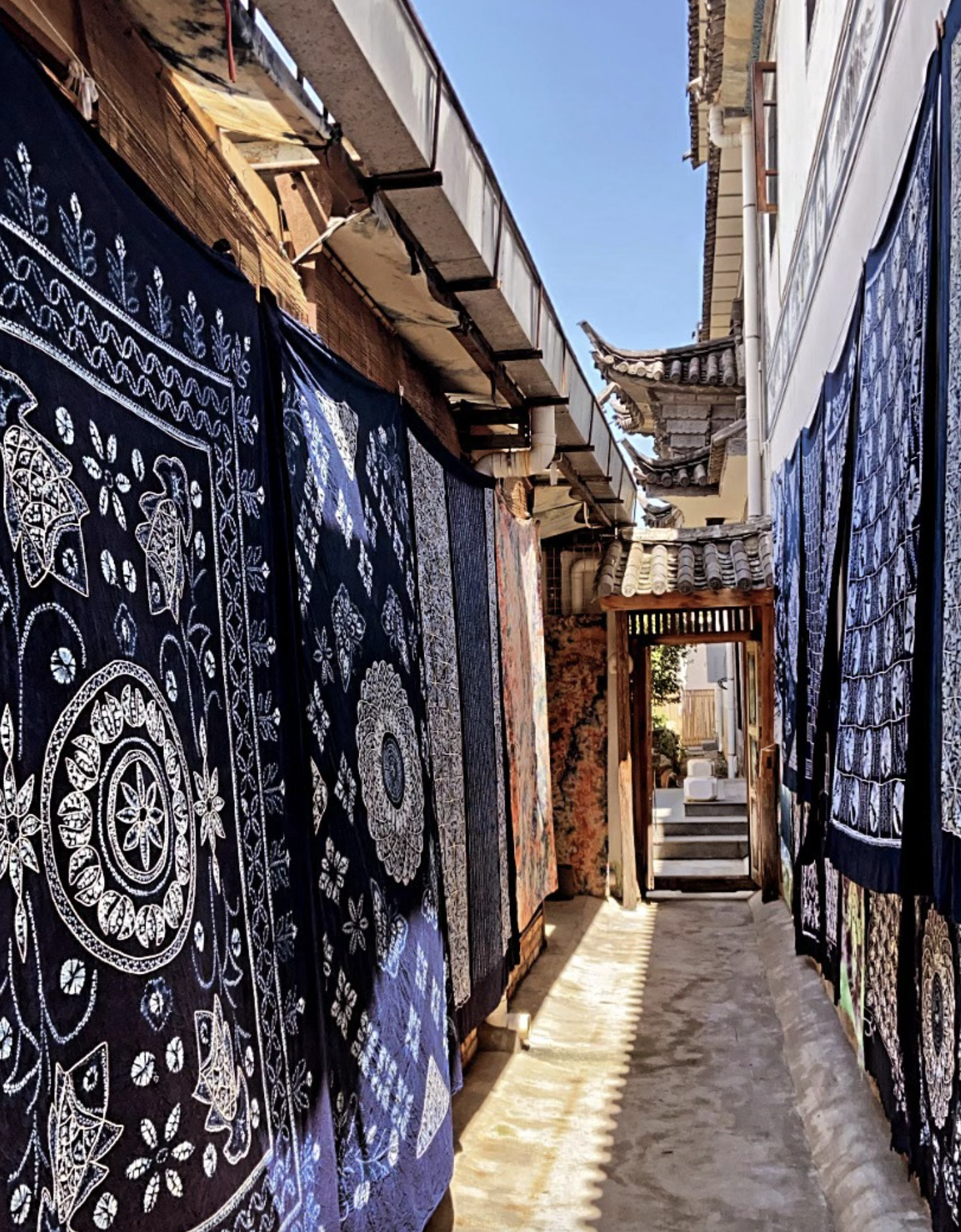 Today, visitors can experience 扎染 (zhārǎn) for themselves in the villages around Dali, especially in Zhoucheng (周城), known as the “hometown of tie-dye.” It’s a slow, meditative process: the dye seeps into the fabric, and time seems to slow with it. Looking up at the tie-dyed cloths swaying in the wind, you feel lost in a sea of blue — soft, endless, and full of freedom.