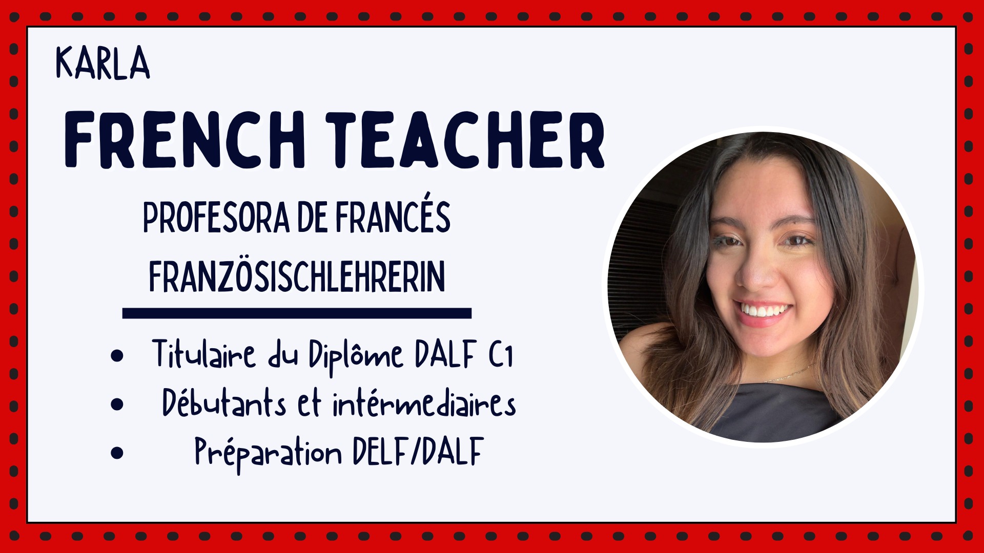 đ„ FĂ©vrier Deal Days ! Save up to 15% on packages. Fun, personalized, and motivating classes! đ Je suis trĂšs Ă l'Ă©coute et je sais m'adapter facilement aux diffĂ©rentes personnalitĂ©s et niveaux de mes Ă©lĂšves. Je suis par nature trĂšs souriante. J'ai beaucoup d'humour et je sais ĂȘtre sĂ©rieuse quand il le faut. C'est donc avec joie que je partage ma bonne humeur pour apprendre avec facilitĂ©. I am very attentive and I know how to adapt easily to the different personalities and levels of my students. I am by nature very smiling. I have a lot of humor and I know how to be serious when it is necessary. It is with joy that I share my good mood to learn with ease.